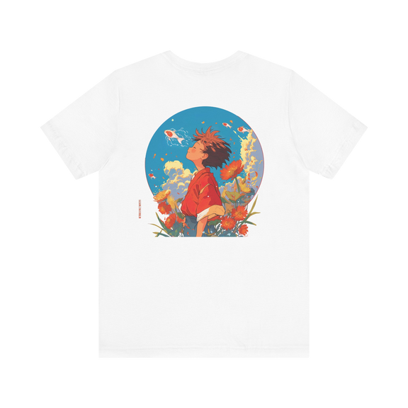 The design features a carefree boy standing in warm sunlight, illustrated in a Studio Ghibli-inspired art style that captures innocence and wonder. With its classic crew neckline and retail fit, this shirt is easy to wear and pairs well with any casual outfit.